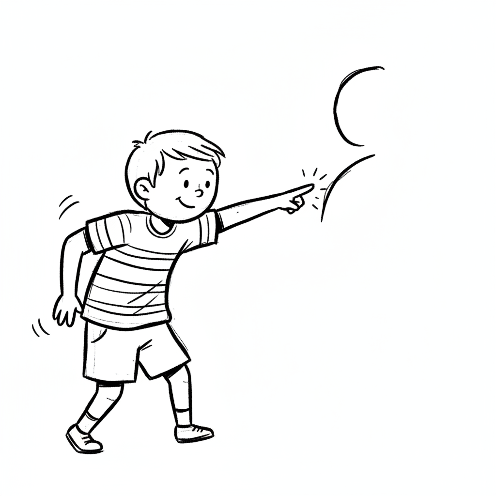 Ein lächelnder Cartoon-Junge zeigt mit dem Finger auf etwas Unsichtbares.