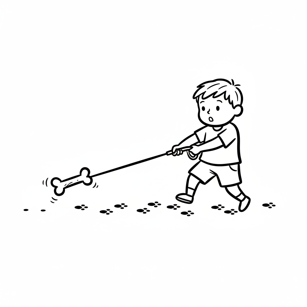 Junge führt Knochen an Leine, folgt Pfotenabdrücken. Er scheint überrascht oder konzentriert.