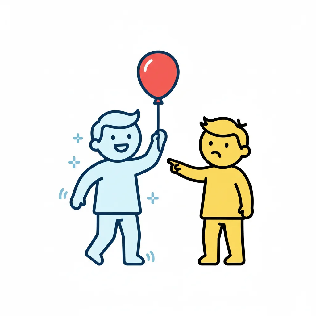 Ein glücklicher Mensch mit Ballon wird von einem neidischen, zeigenden Menschen kritisiert.