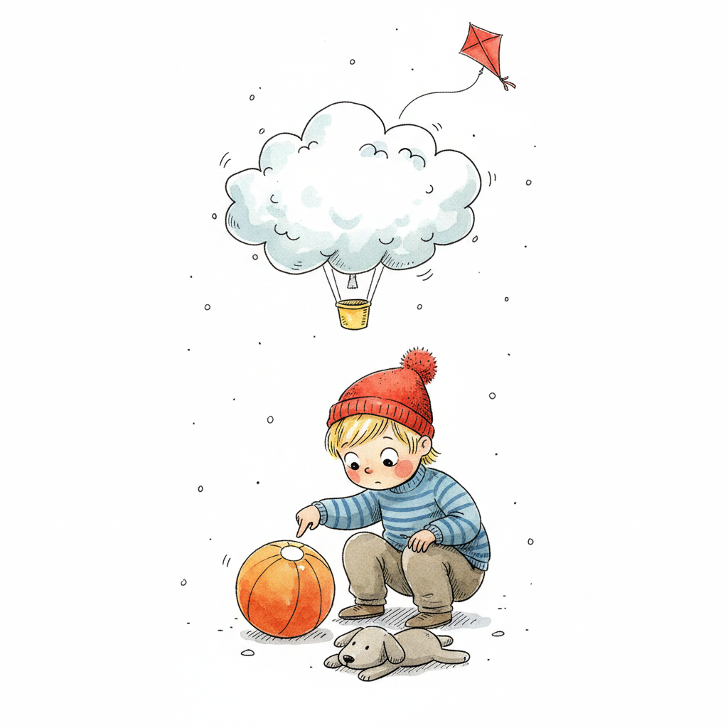 Ein Kind mit roter Mütze spielt mit einem Ball, ein Hund liegt daneben. Darüber schwebt ein Wolkenballon.
