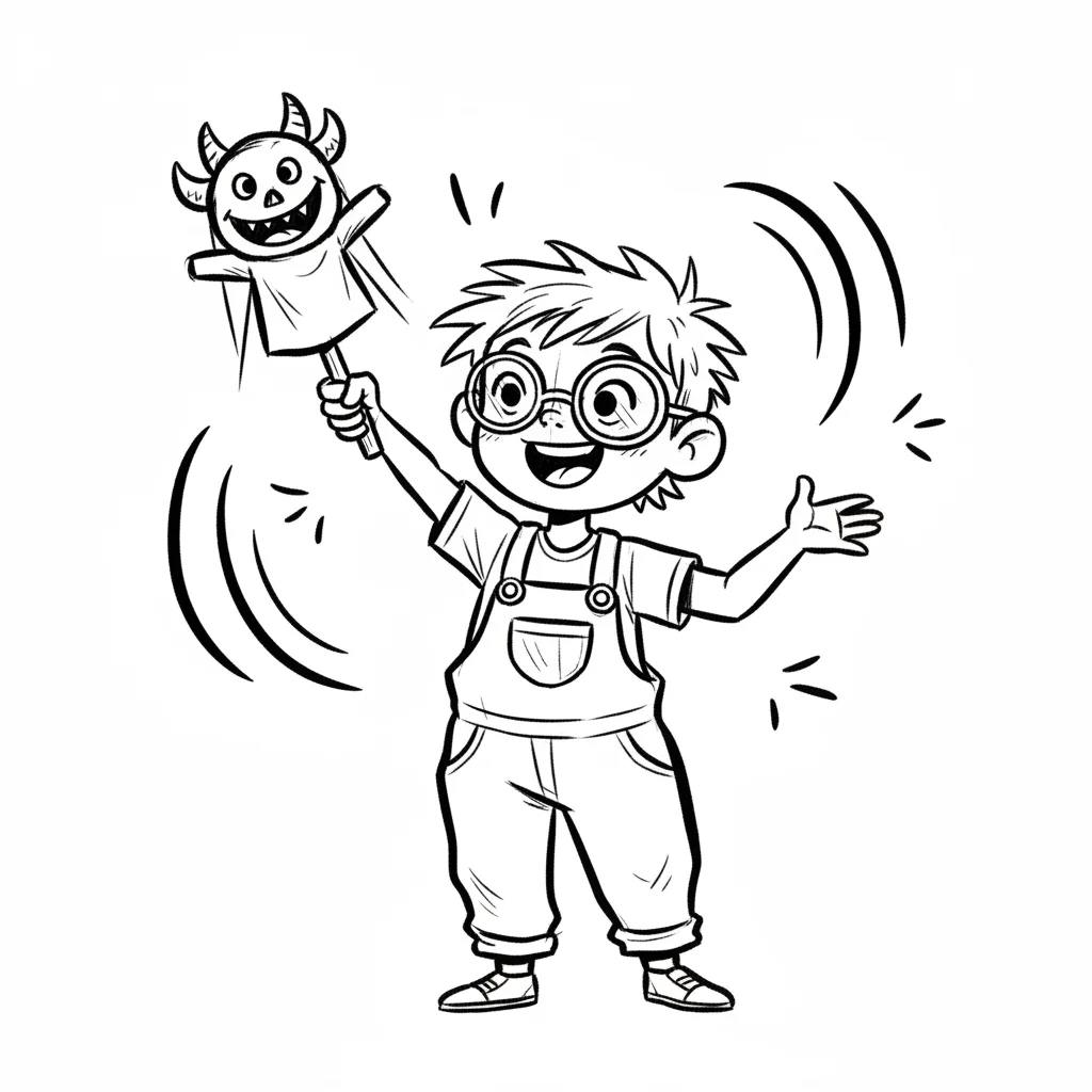 Glücklicher Junge mit Brille spielt mit einer Monster-Handpuppe. Schwarz-Weiß-Zeichnung.