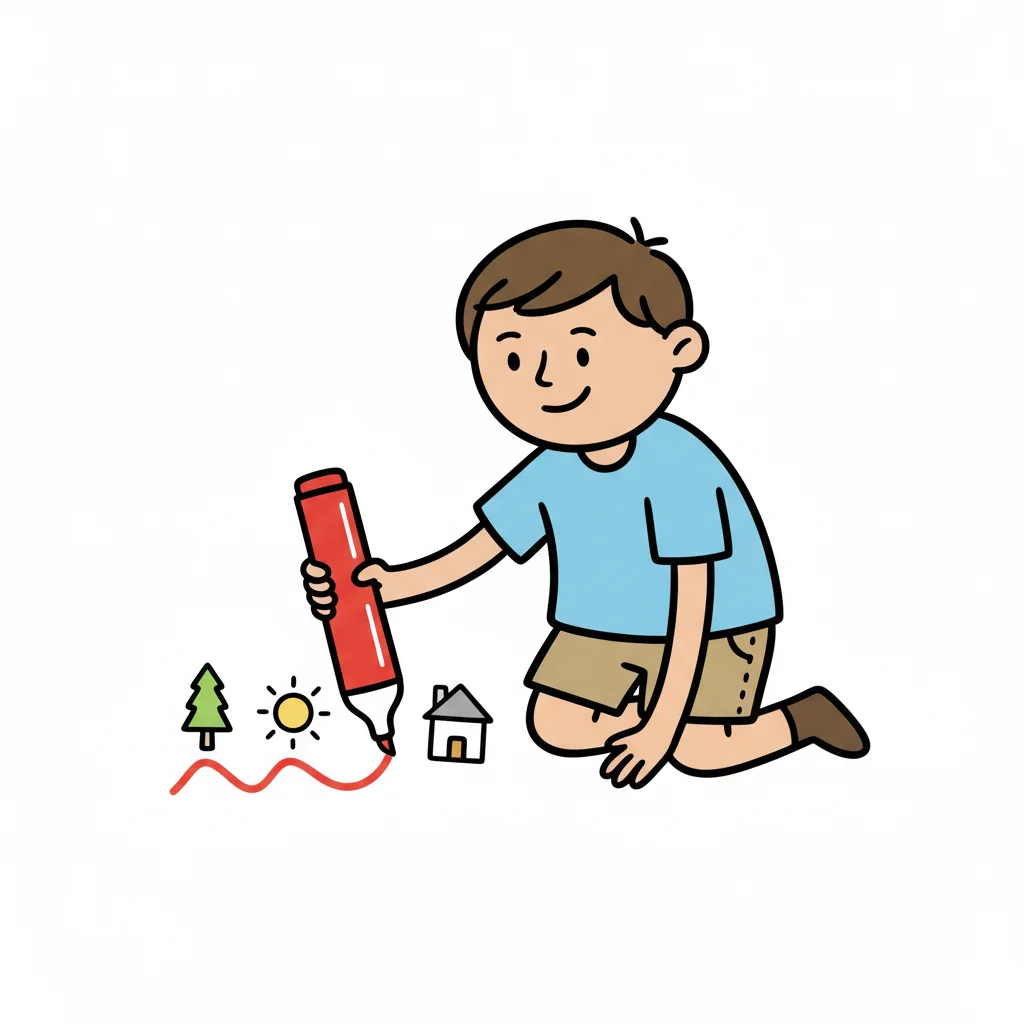 Ein Junge zeichnet mit einem großen roten Bleistift auf Papier.