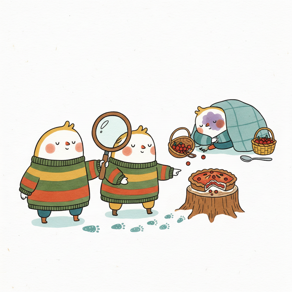 Zwei Vögel untersuchen Spuren und einen halb gegessenen Kirschkuchen, während ein dritter Vogel schläft.