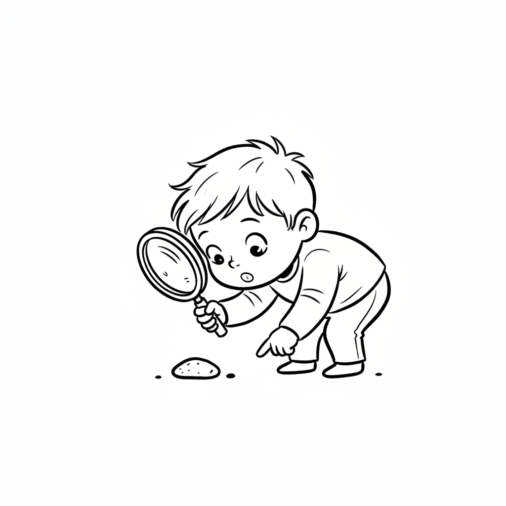 Ein neugieriger Junge mit Lupe erforscht einen kleinen Gegenstand auf dem Boden.