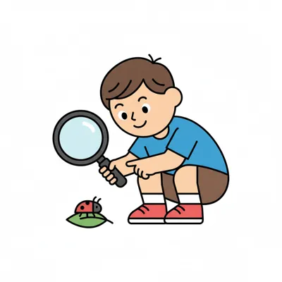 Cartoon-Junge mit Lupe beobachtet einen Marienkäfer auf einem Blatt.