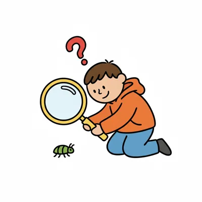 Junge mit Lupe beobachtet ein Insekt, mit einem Fragezeichen über seinem Kopf.