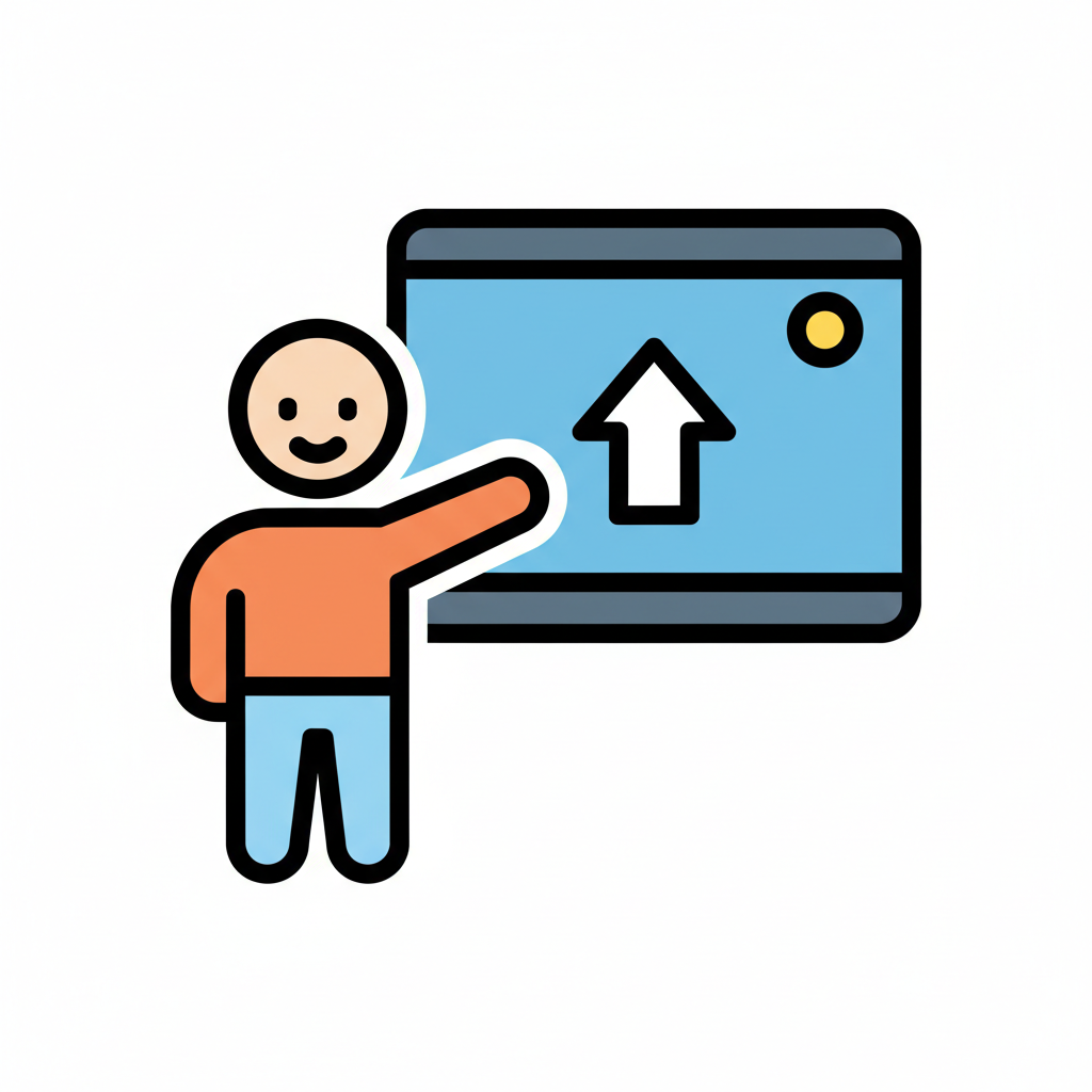 Ein lächelndes Strichmännchen zeigt auf einen Bildschirm mit einem Upload-Pfeil.