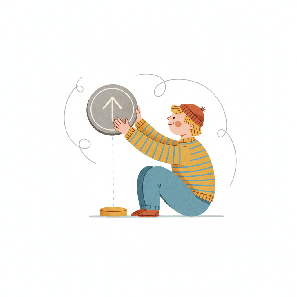 Ein Junge hält einen großen Pfeil-nach-oben-Knopf, der mit einem kleineren Knopf verbunden ist.