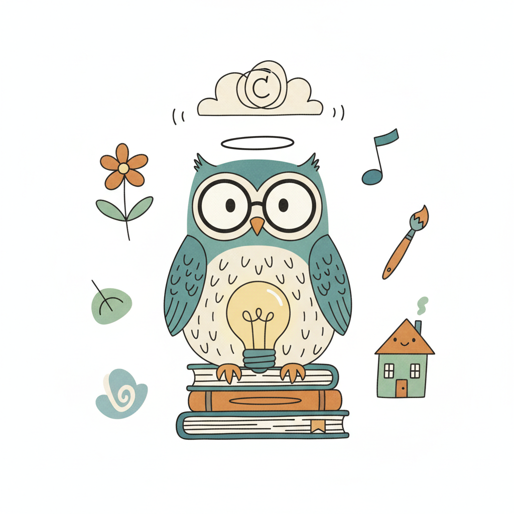 Cartoon-Eule auf Büchern mit Glühbirne, umgeben von Symbolen für Kreativität, Wissen & Natur.
