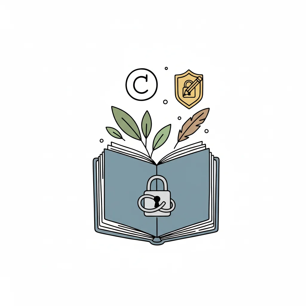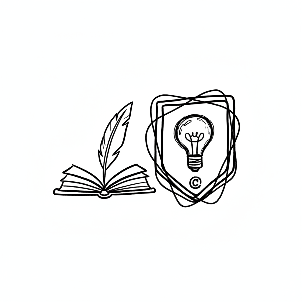 Handgezeichnetes Icon: Offenes Buch mit Feder und Schild mit Glühbirne und Copyright-Symbol.