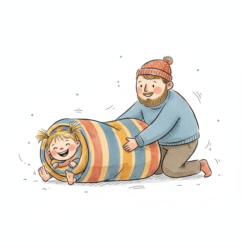 Glücklicher Vater schiebt lachendes Kind in einem gestreiften Spieltunnel.