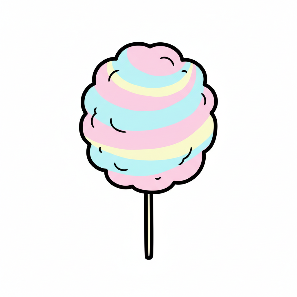 Bunte Zuckerwatte auf einem Stiel in Pastellfarben (rosa, blau, gelb) als Illustration.