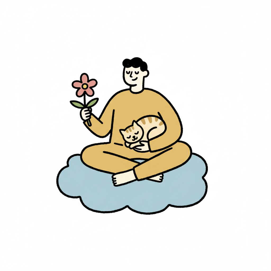 Illustration: Eine Person sitzt entspannt auf einer Wolke, hält eine Blume und eine schlafende Katze.