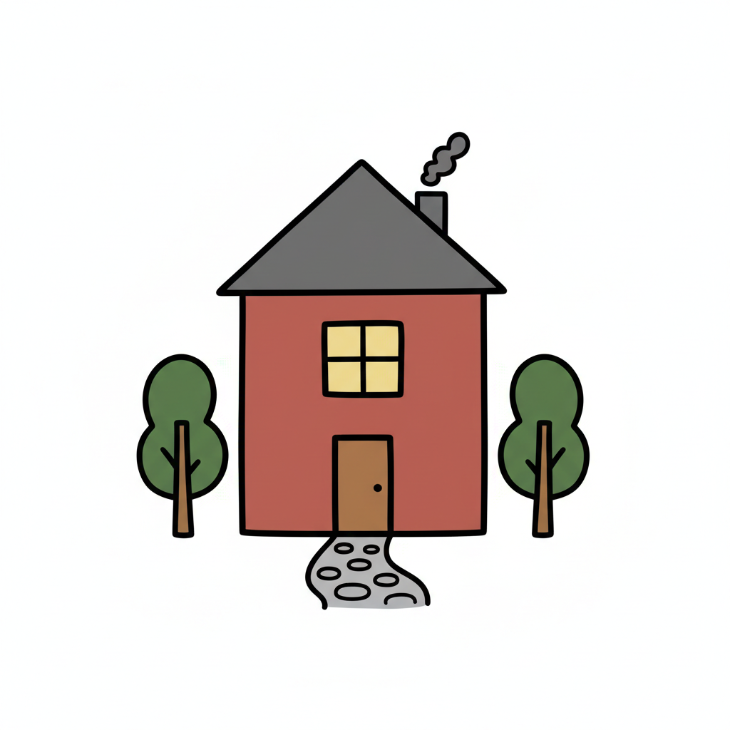 Einfache Cartoon-Zeichnung eines roten Hauses mit Bäumen, Schornsteinrauch und Steinweg.