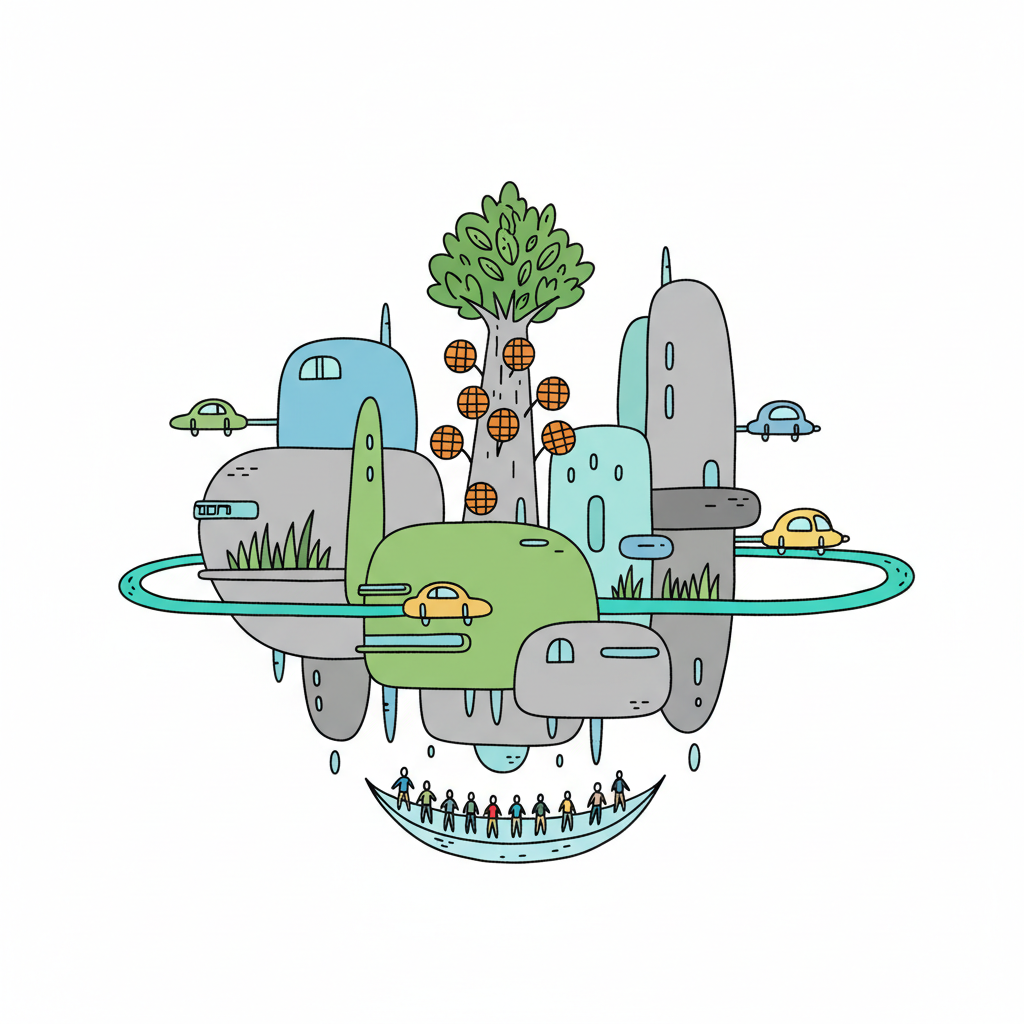 Whimsische Illustration einer schwebenden Inselstadt mit Häusern, Autos, Bäumen und Menschen in einem Boot.