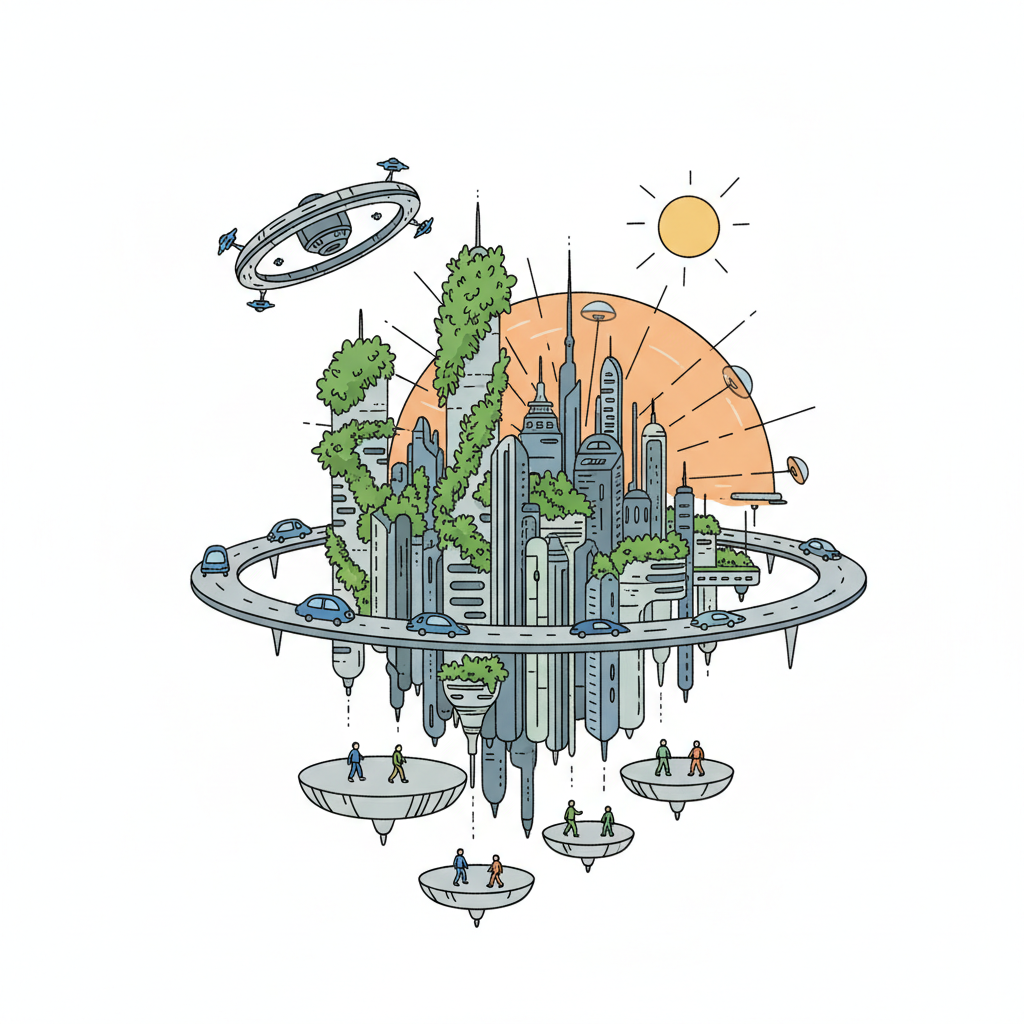 Futuristische, schwebende Stadt mit begrünten Gebäuden, fliegenden Autos und Plattformen unter der Sonne.