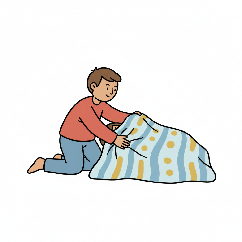 Ein Mann kniet und deckt eine Person mit einer bunten Decke zu, die darunter liegt. Fürsorglich.