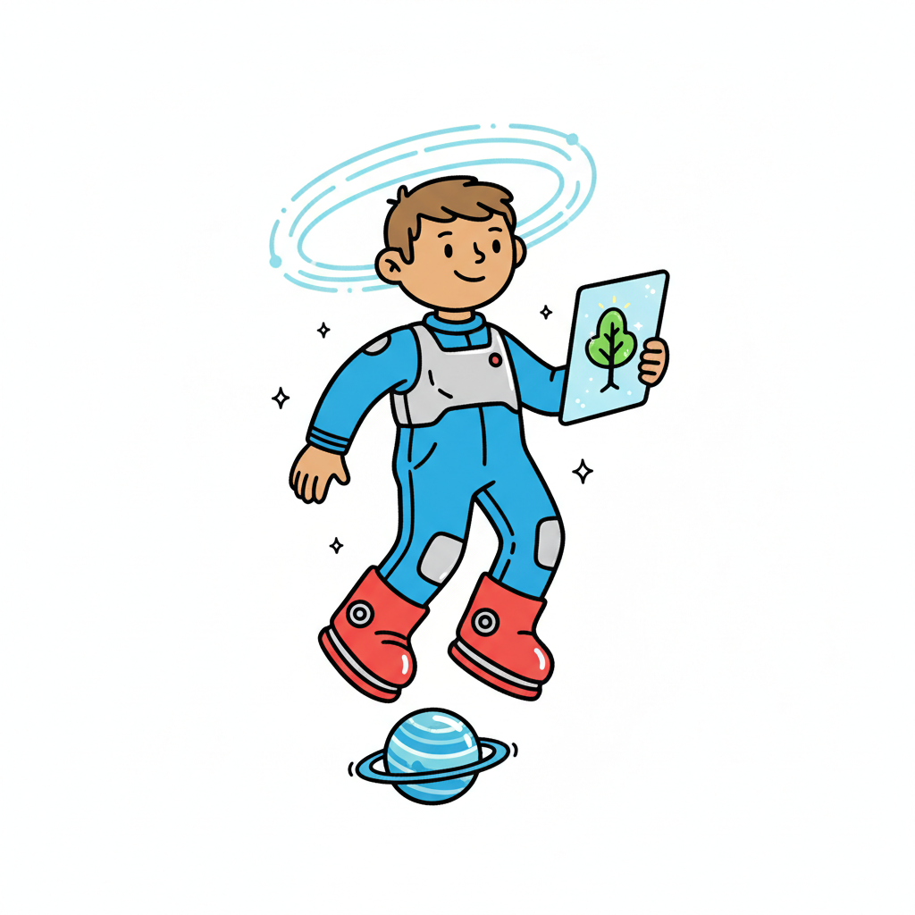 Astronautenjunge schwebt über Saturn und hält ein Tablet mit einem Baum-Symbol.
