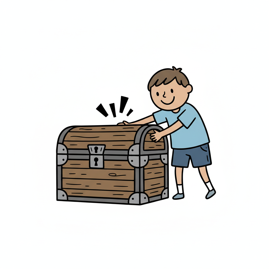 Ein lächelnder Junge steht vor einer Schatzkiste, bereit, sie zu öffnen.