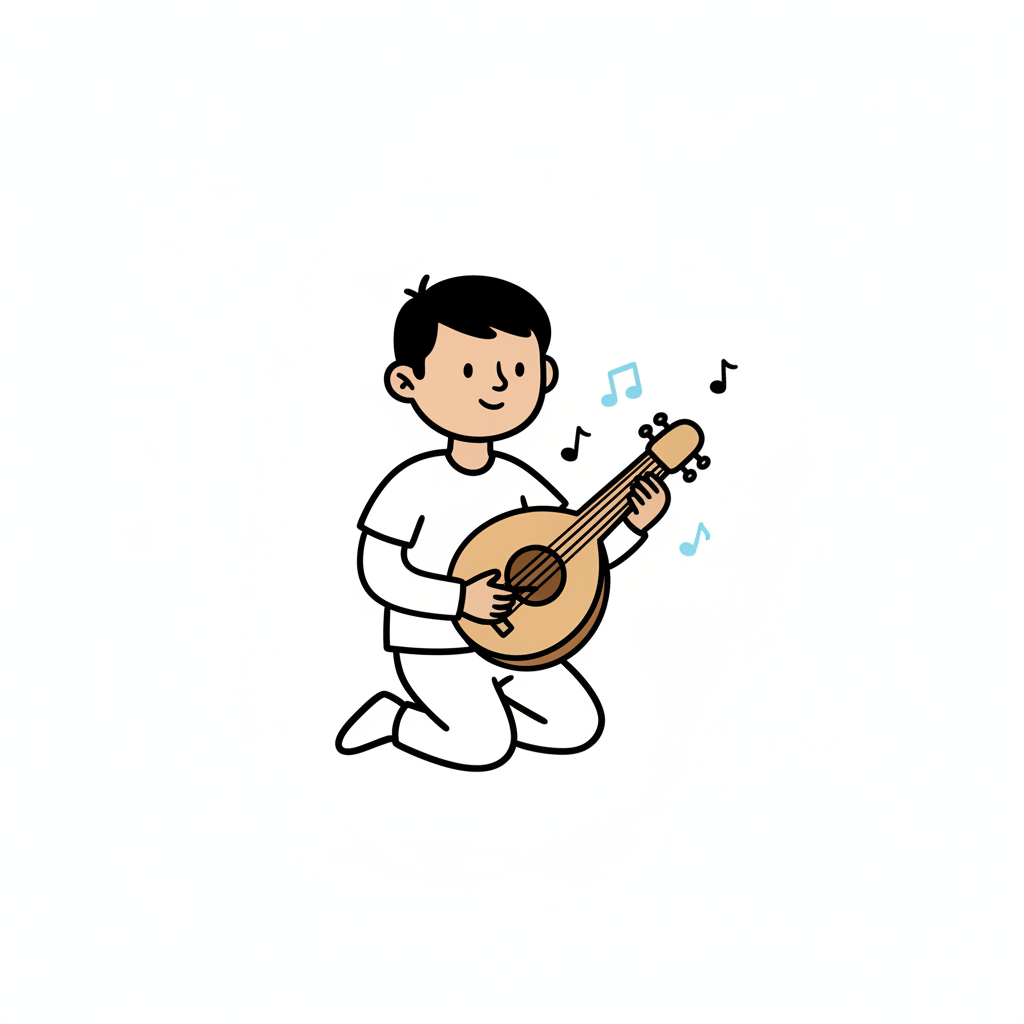 Kniende Cartoonfigur spielt ein Saiteninstrument, Musiknoten schweben umher.