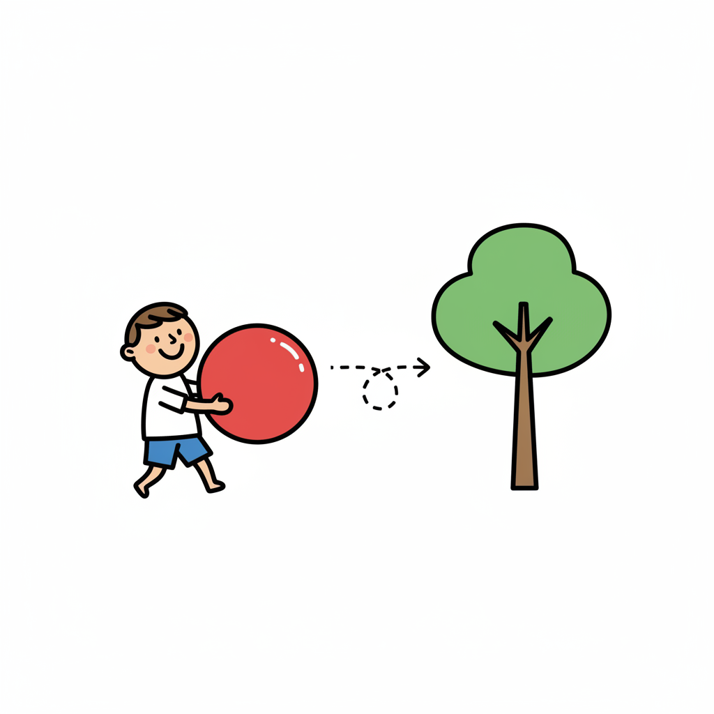 Ein lächelnder Cartoon-Junge wirft einen roten Ball in Richtung eines Baumes.