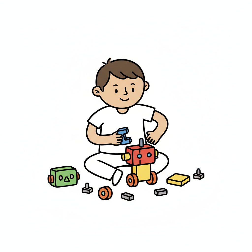 Ein lächelnder Junge sitzt und baut einen Roboter aus bunten Bausteinen.