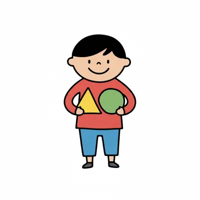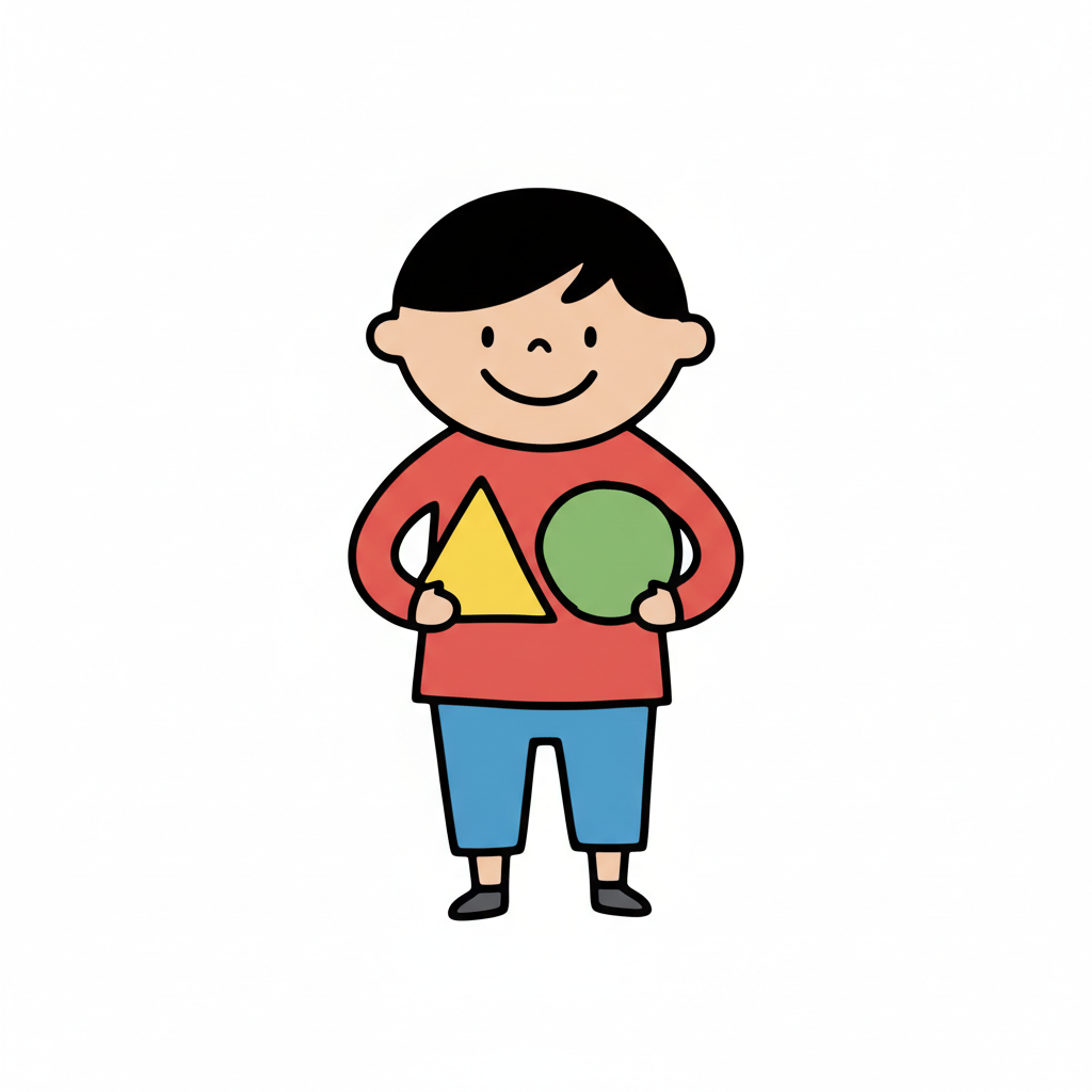 Ein lächelnder Cartoon-Junge hält ein gelbes Dreieck und einen grünen Kreis.