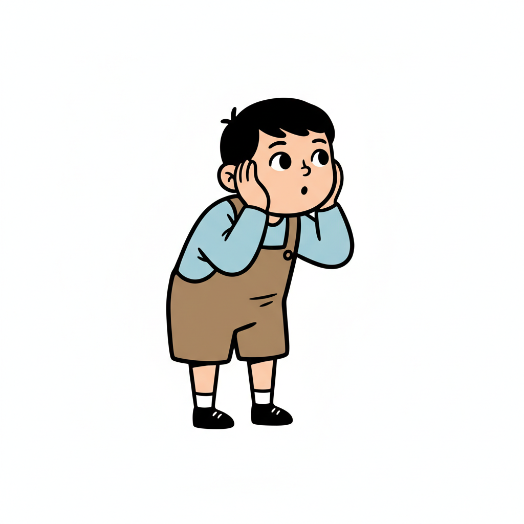 Niedlicher Cartoon-Junge mit Händen an den Wangen, blickt überrascht nach oben.