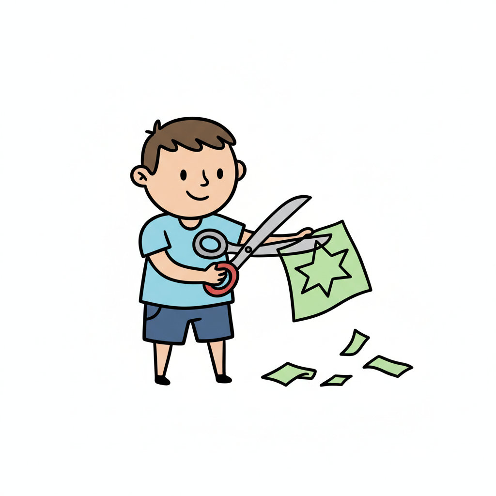 Ein lächelnder Cartoon-Junge schneidet mit einer Schere eine Sternform aus grünem Papier.