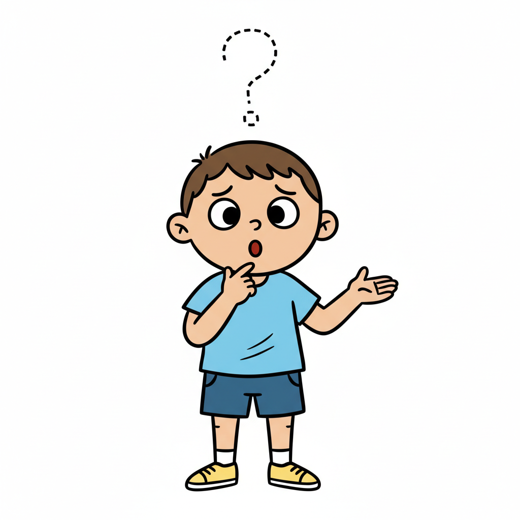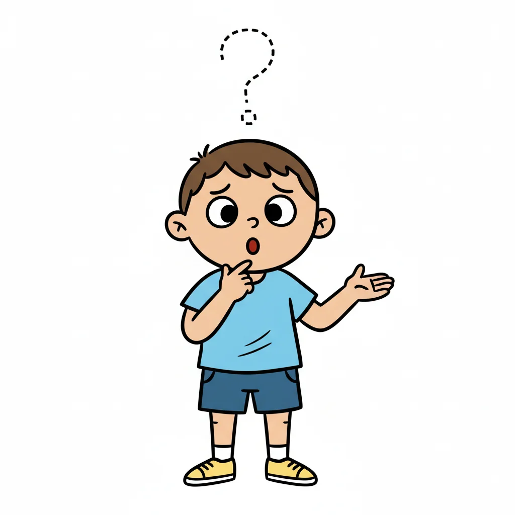 Junge mit Fragezeichen über dem Kopf, nachdenklich und verwirrt.
