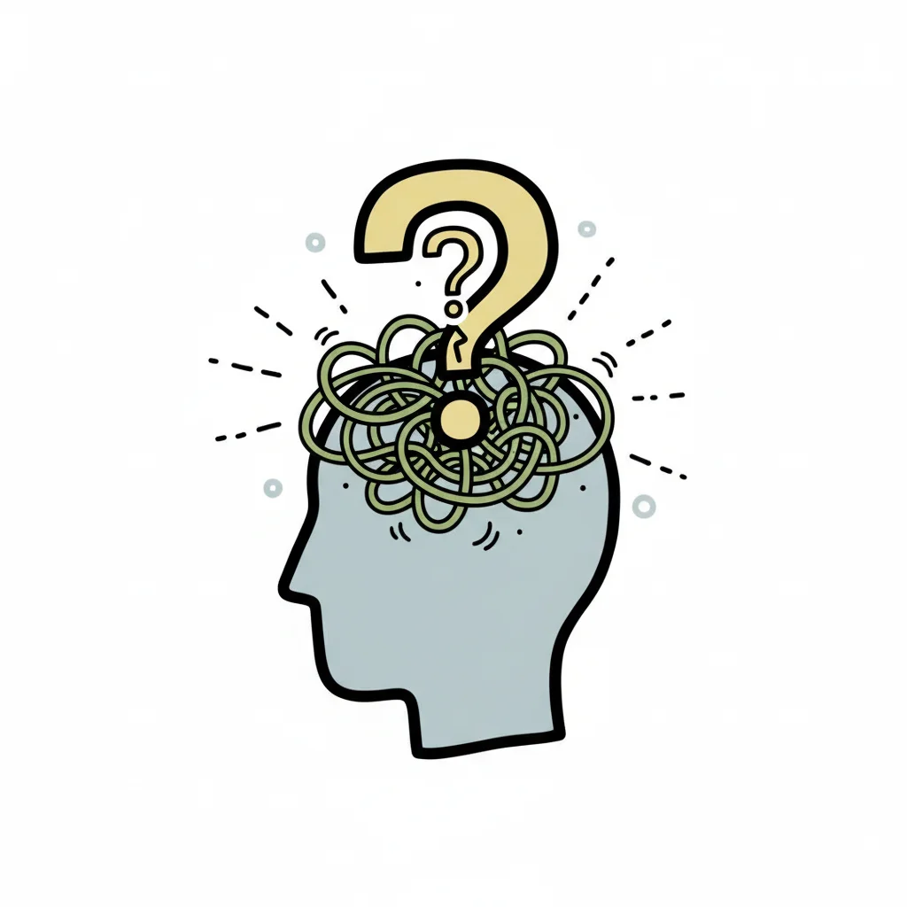 Kopf mit verworrenen Gedanken und einem Fragezeichen, symbolisiert Verwirrung oder Problem.