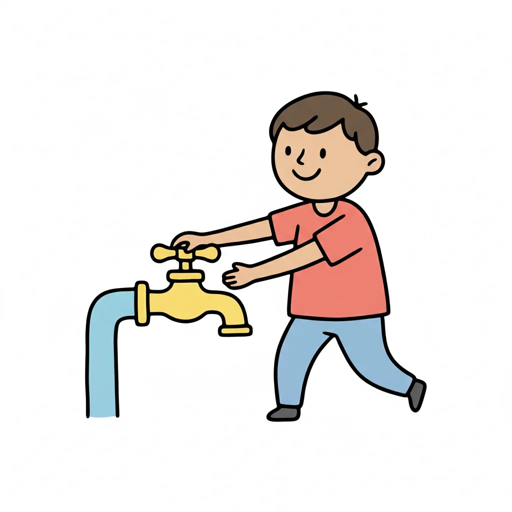 Ein fröhlicher Junge dreht einen Wasserhahn auf, aus dem Wasser strömt.