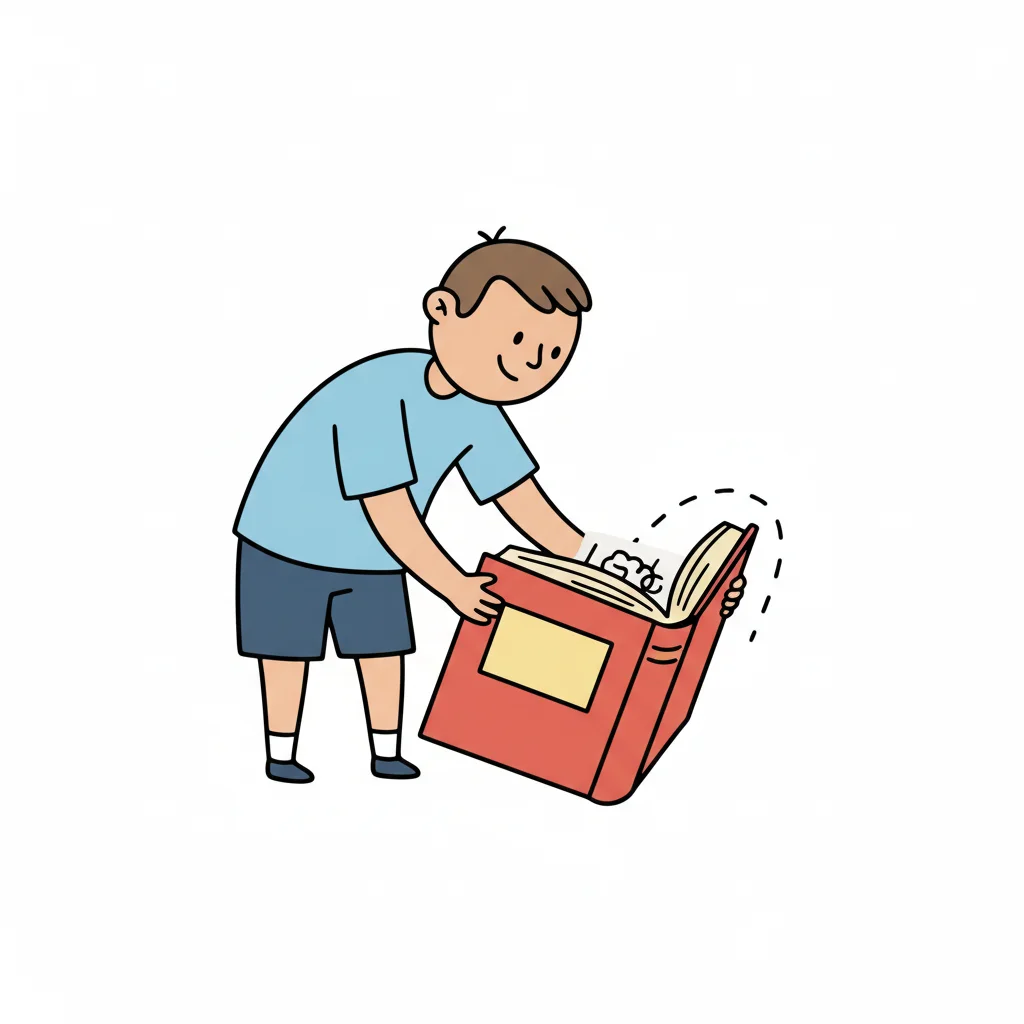 Ein lächelnder Cartoon-Junge schaut neugierig in ein großes rotes Buch und entdeckt etwas.