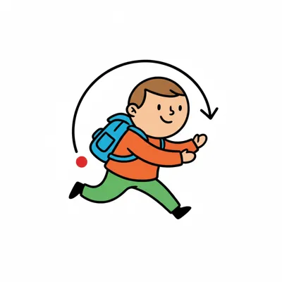 Ein lächelnder Cartoon-Junge mit blauem Rucksack rennt, ein Pfeil deutet auf Bewegung.