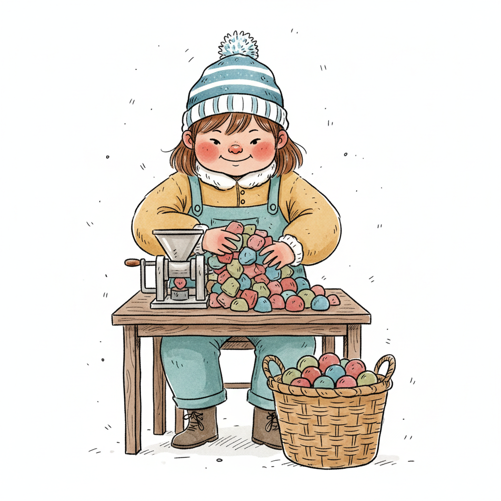 Niedliches Kind in Winterkleidung macht bunte Süßigkeiten an einem Tisch mit einer Maschine.