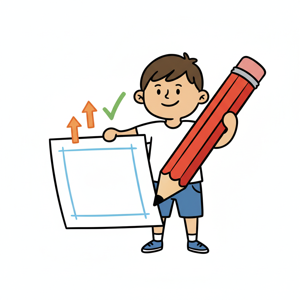 Cartoon-Junge mit riesigem Bleistift und Papier, das Fortschrittspfeile und einen Haken zeigt.