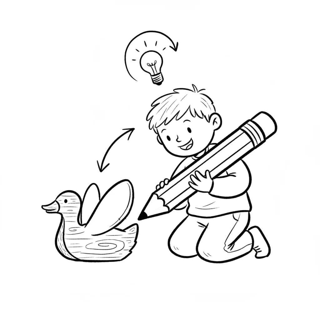 Ein Junge zeichnet eine Holzente mit einem großen Bleistift. Eine Glühbirne symbolisiert Kreativität.