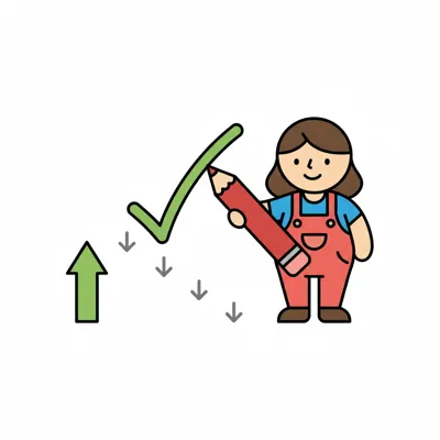 Figur zeichnet Haken über Abwärtspfeilen, was Korrektur und Verbesserung symbolisiert.