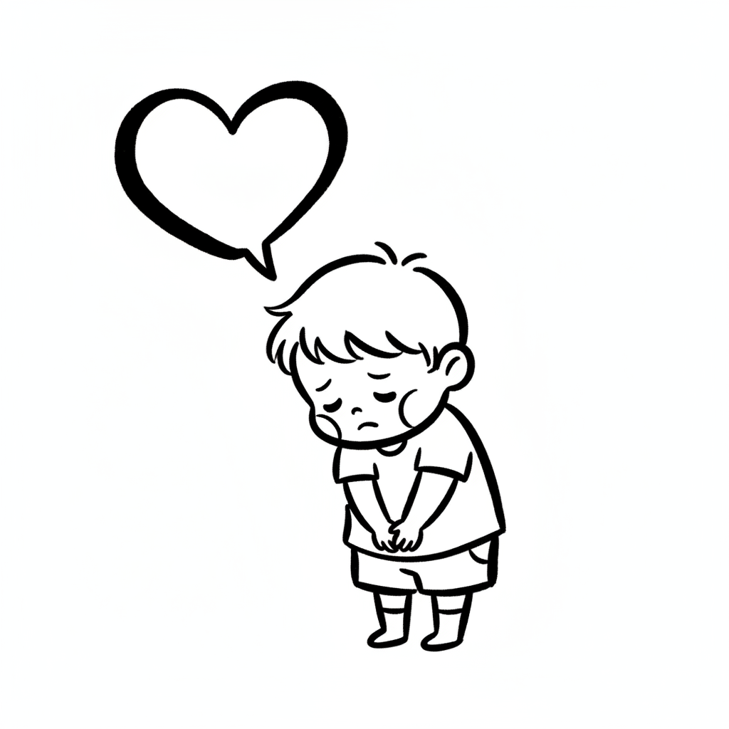 Trauriger Cartoon-Junge verbeugt sich mit Herz-Sprechblase, drückt Reue oder Liebe aus.
