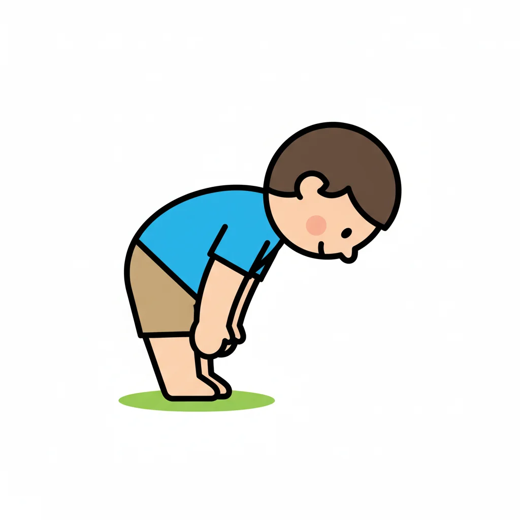 Ein Cartoon-Junge verbeugt sich höflich auf einem grünen Fleckchen Gras.