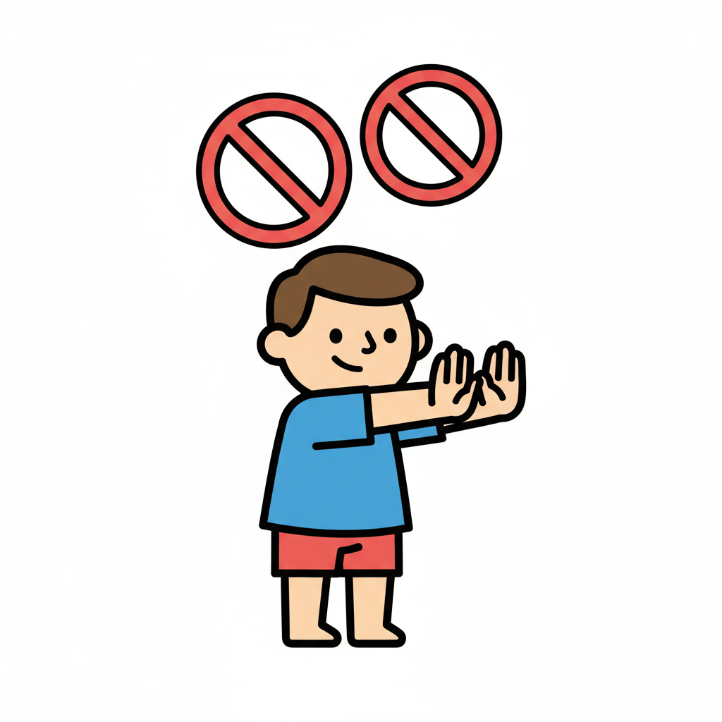 Junge macht Stopp-Geste, darüber zwei Verbotszeichen. Symbolisiert Ablehnung oder Verbot.