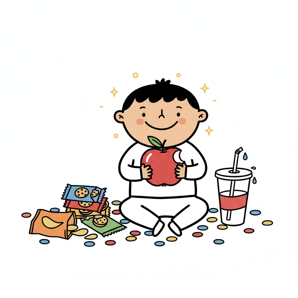 Glückliches Kind isst Apfel, umgeben von Süßigkeiten und Snacks. Gesunde Wahl.