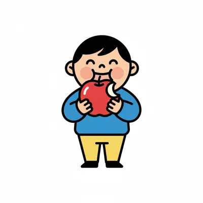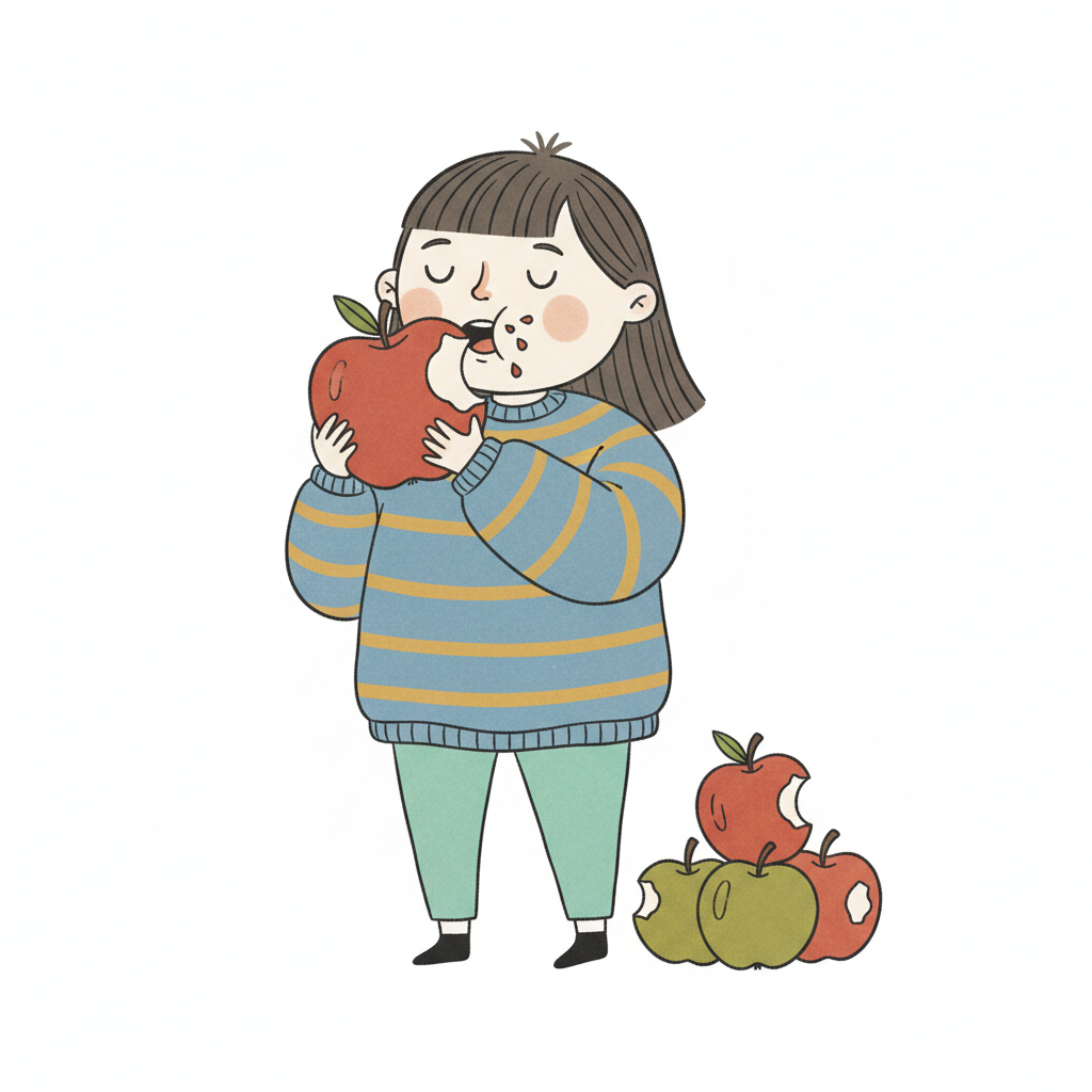 Cartoonmädchen isst genüsslich einen Apfel, daneben liegen Apfelreste.