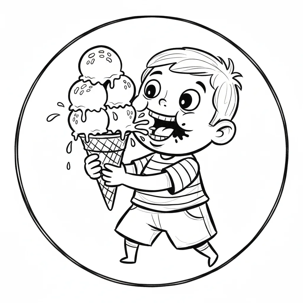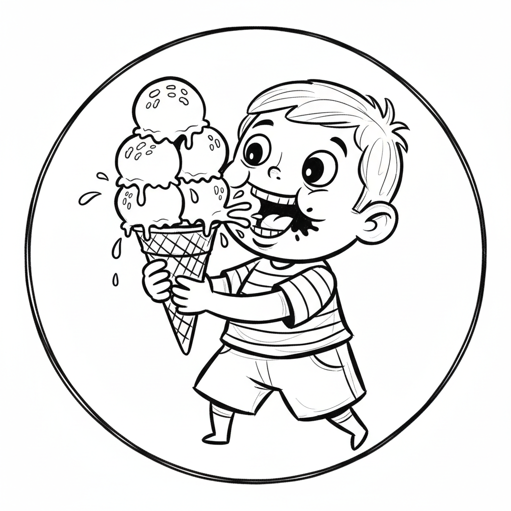 Ein fröhlicher Cartoon-Junge isst genüsslich ein großes Eis, sein Gesicht ist verschmiert.