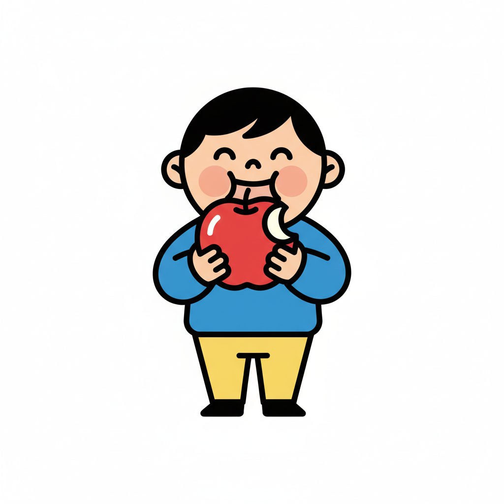 Glücklicher Cartoon-Junge isst einen roten Apfel mit einem Biss.