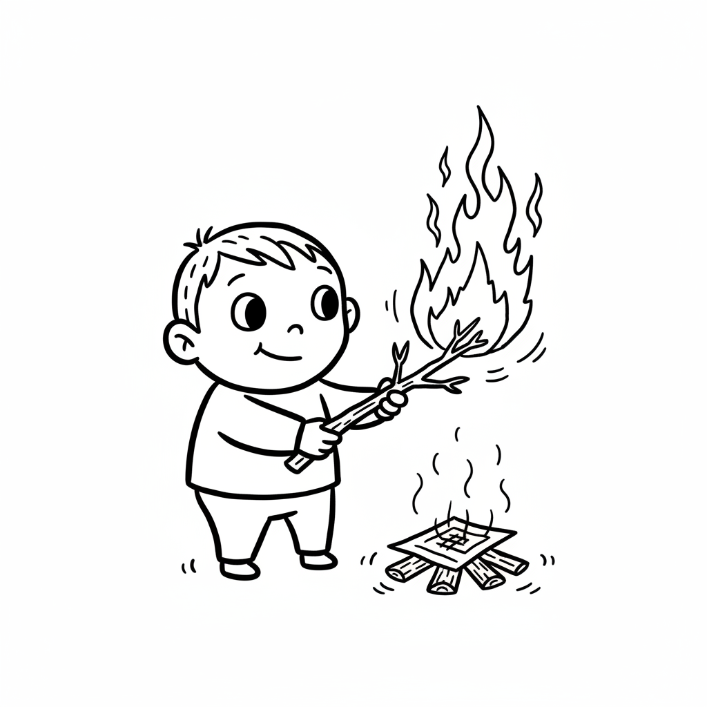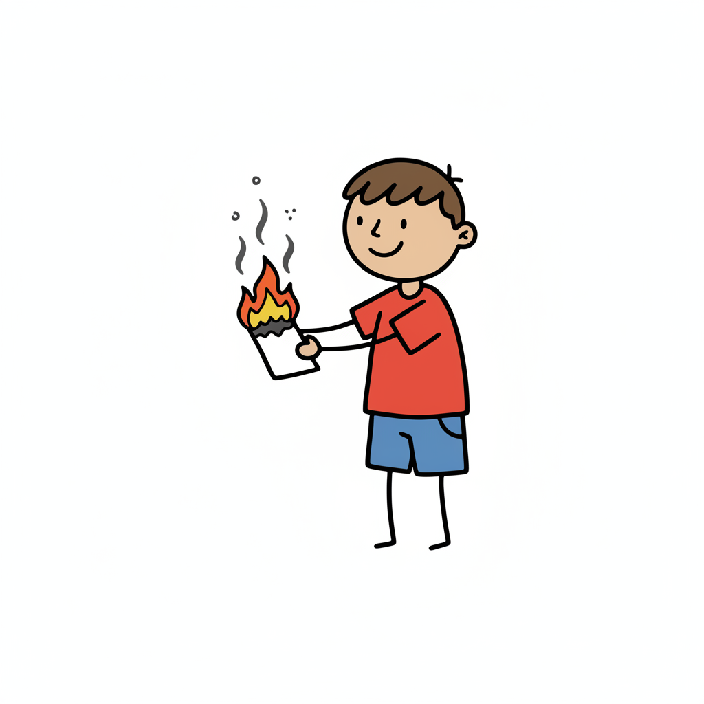 Ein lächelnder Cartoon-Junge hält ein brennendes Blatt Papier mit Flammen und Rauch.