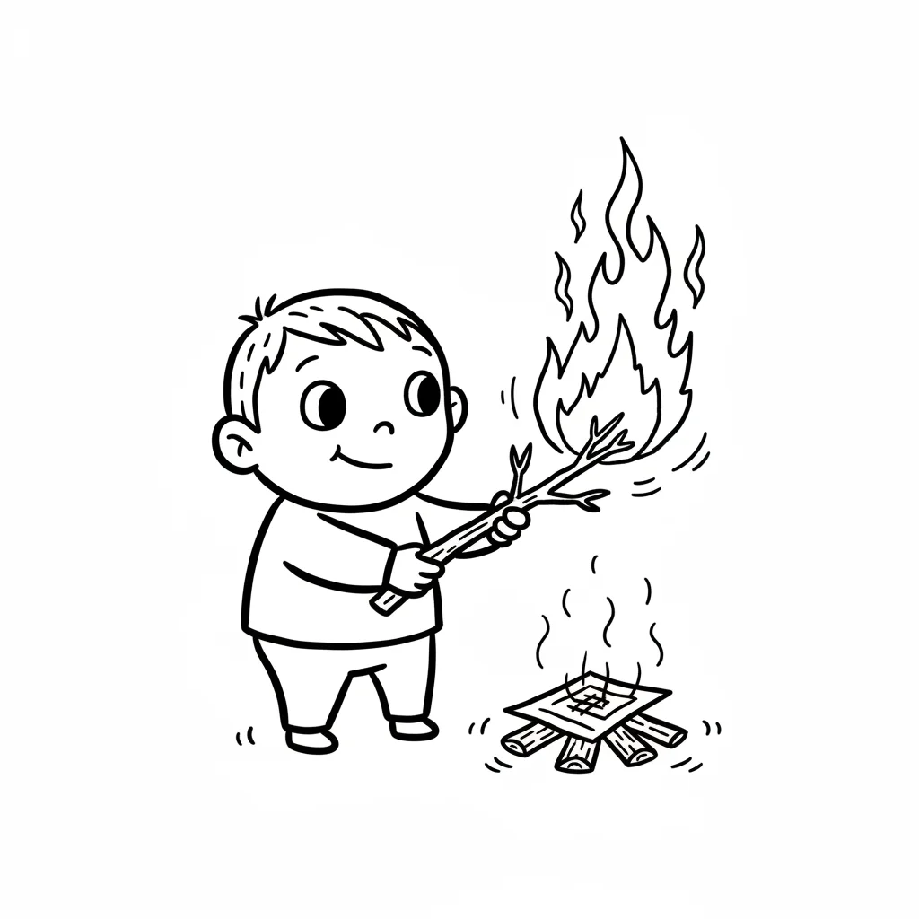 Ein lächelnder Cartoon-Junge mit Mütze und Pullover hält eine brennende Fackel neben einem Lagerfeuer.