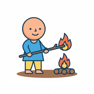 Lächelnde Cartoonfigur entzündet ein Lagerfeuer mit einem brennenden Stock.