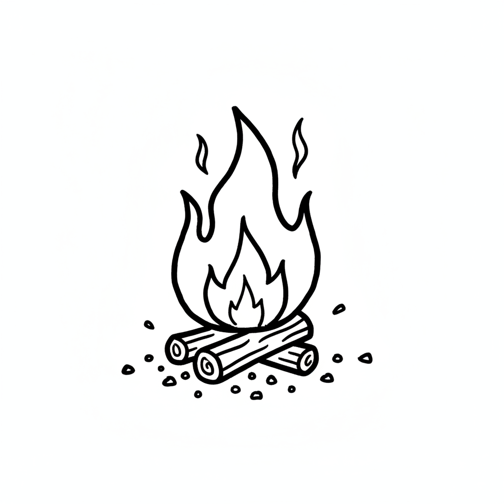 Schwarz-weiße Strichzeichnung eines Lagerfeuers mit Holzscheiten und Flammen.
