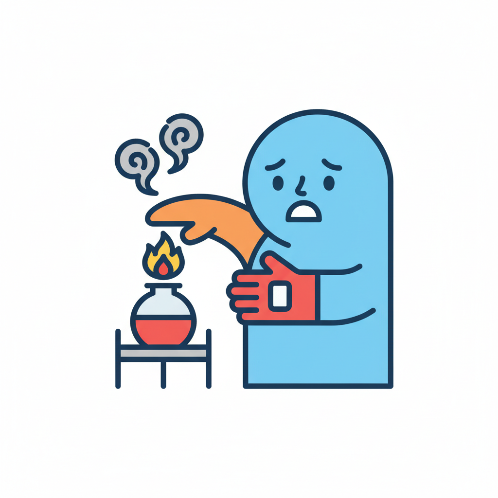 Cartoonfigur verbrennt sich die Hand an einem brennenden Kolben, Rauch steigt auf.